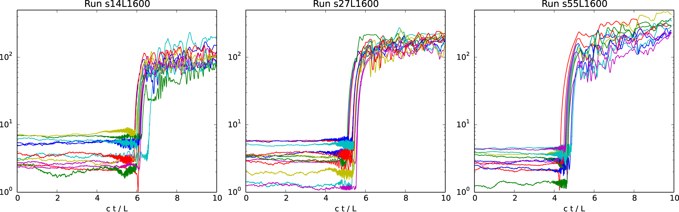 Energy histories γ(t) for individual particles selected for their high energy at ct/L = 10. Each diagram shows roughly 10 most energetic particles.
