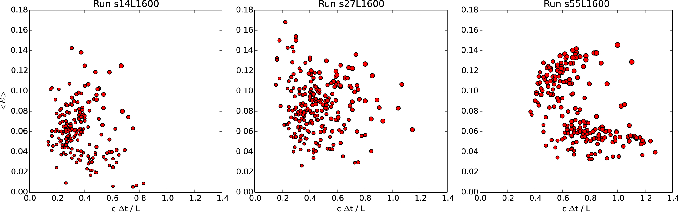 Duration vs. mean electric field calculated for the main acceleration episodes for representative samples of energetic individually tracked particles. The area of the markers is proportional to the final particle energy γfin calculated for ct/L = 10. Each diagram shows roughly 200 most energetic particles.