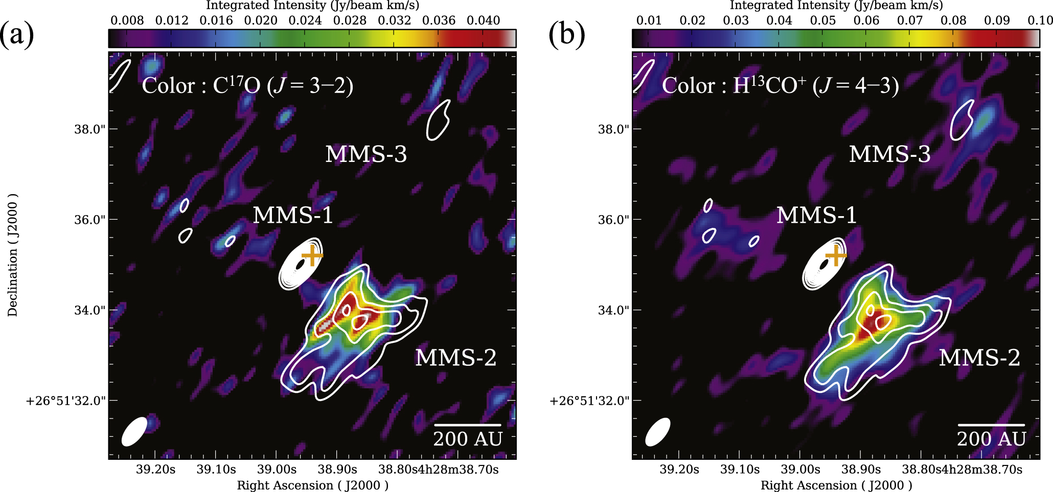 Gas/dust distributions of the high-density condensations of MC27/L1521F in Band 7 obtained by the 12 m array alone. (a) Total velocity-integrated intensities of C17O (J = 3–2) are shown in color scale. (b) Total velocity-integrated intensities of H13CO+ (J = 4–3) are shown in color scale. White contours represent the image of the 0.87 mm dust continuum emission in both (a) and (b). The lowest contour and subsequent contour step are 3σ and 2σ; 1σ ∼ 0.1 mJy beam−1. The angular resolutions are given by the ellipses in the lower left corners in each panel, 0.″73 × 0.″34. Orange crosses in each panel represent the position of the Spitzer source.