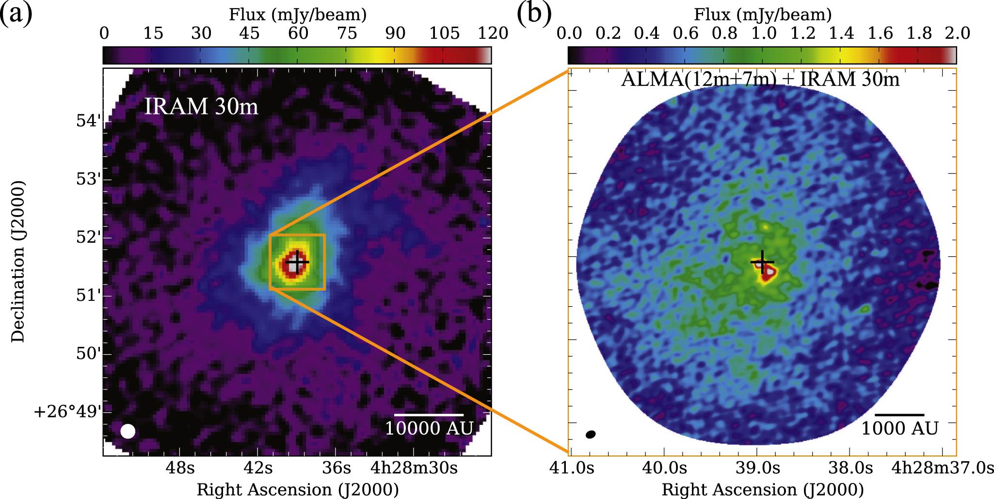 Distributions of 1.2 mm dust continuum emission toward MC27/L1521F. (a) Color scale shows 1.2 mm dust continuum image with the IRAM 30 m telescope using the MAMBO-2 bolometer at angular resolution of 14″. The angular resolution is given by the circle in the lower left corner. (b) Color scale image shows the 1.2 mm dust continuum image combining the ALMA data (the 12 m array + the 7 m array) with IRAM 30 m data. The angular resolution of the combined image is given by black ellipse in the lower left corner, 1.″3 × 0.″8. Black crosses in each panel represent the position of the Spitzer source.