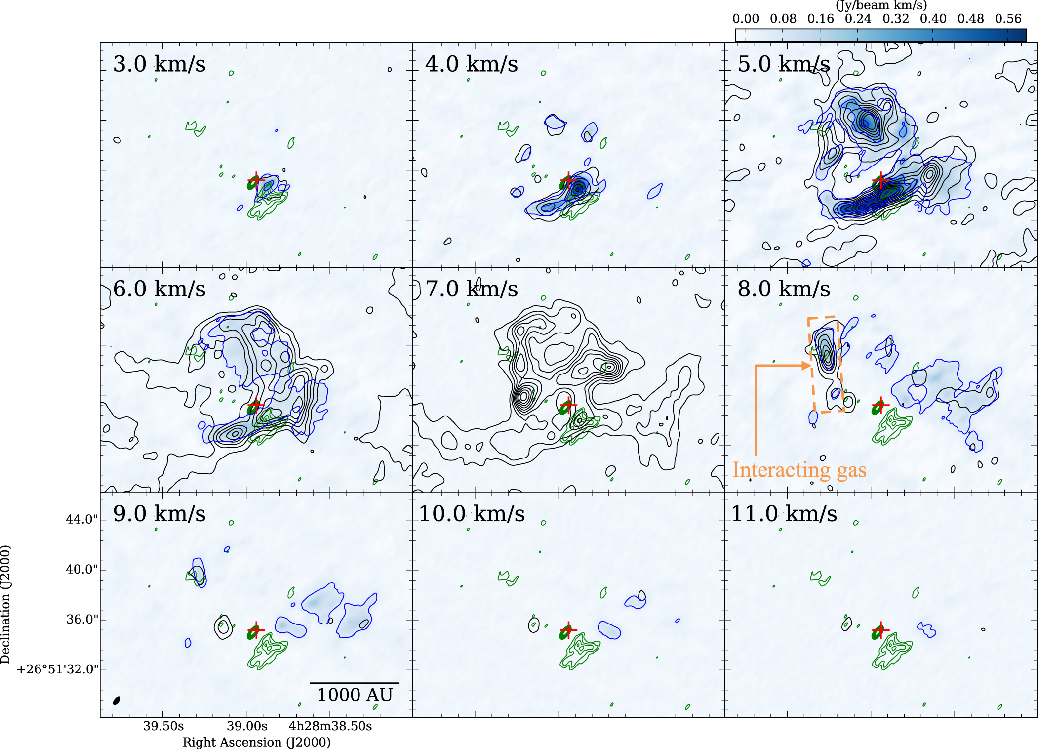 Velocity-channel maps of the 12CO (J = 3–2) and HCO+ (J = 3–2) emission toward MC27/L1521F. Blue color scale and blue contours show velocity-range-integrated intensity maps of 12CO (J = 3–2) data. Black contours show those of HCO+ (J = 3–2) data (Tokuda et al. 2014). The lowest contour and subsequent step of the blue contours are 0.05 and 0.2 Jy beam−1 km s−1, respectively. The lowest contour and subsequent contour step of the black contours are 0.02 and 0.04 Jy beam−1 km s−1, respectively. The velocity span for each map is 1.0 km s−1. The lowest velocities are given in the upper left corner of each panel. Green contours show the image of 0.87 mm dust continuum emission, as in Figure 1. The angular resolution of the 12CO (J = 3–2) is given by the white ellipse in the lower left corner of the bottom left panel, 0.″73 × 0.″33. Red plus signs of each panel represent the position of the Spitzer source. The dashed orange rectangle in panel of the 8.0 km s−1 shows interacting gas with a compact outflow, discussed by Tokuda et al. (2014).