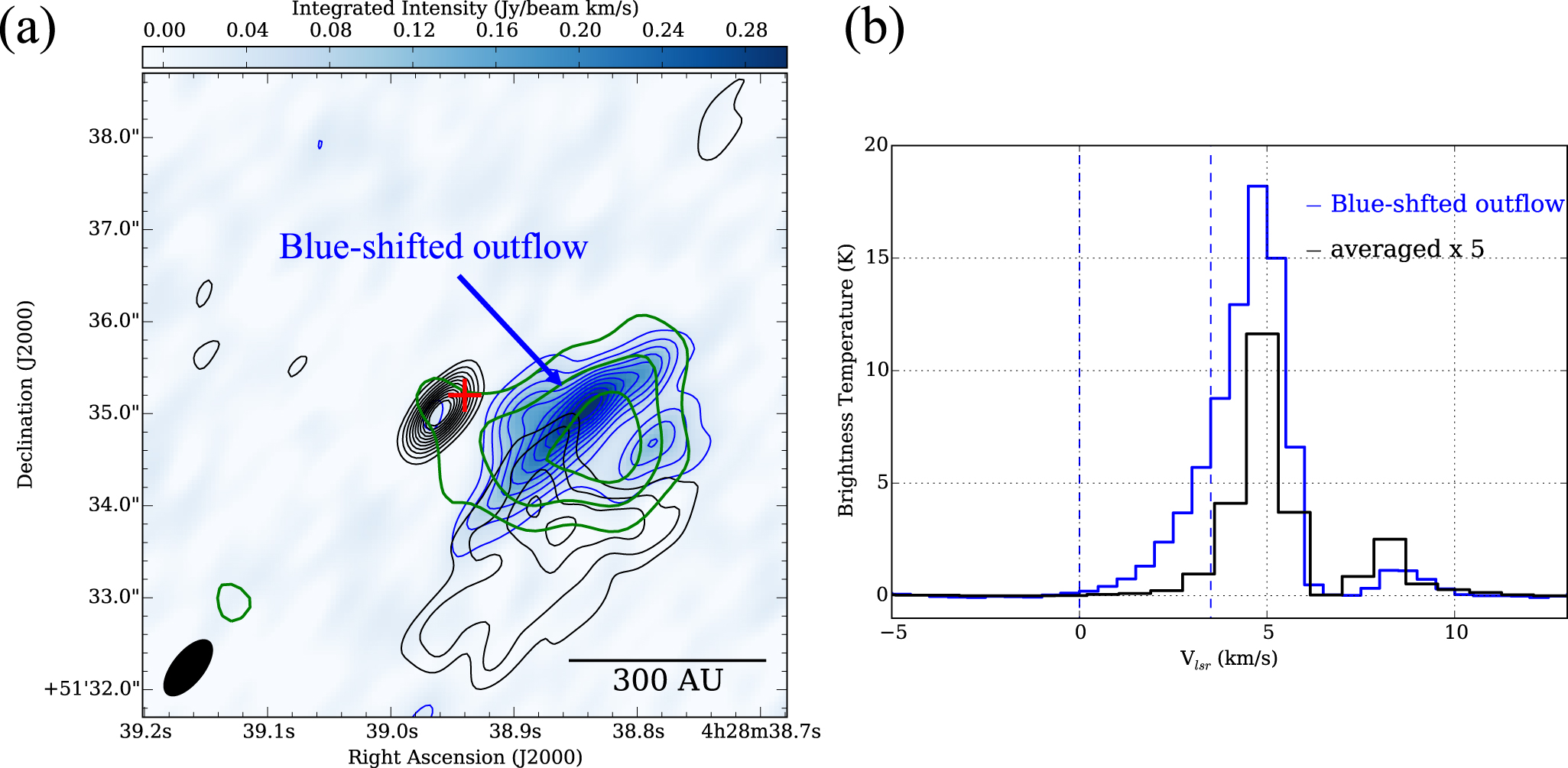 Distribution of blueshifted outflow from the Spitzer source. (a) The blue color scale image and blue contours show images of velocity-integrated intensity of 12CO (J = 3–2) with a velocity range of 0.0–4.0 km−1. The lowest contour and subsequent contour step are 0.03 Jy beam−1 km s−1. Black contours show the image of 0.87 mm dust continuum emission, as in Figure 1. The angular resolution of the 12CO (J = 3–2) is given by the black ellipse in the lower left corner of the bottom left panel, 0.″73 × 0.″33. The red plus sign represents the position of the Spitzer source. Green contours show images of velocity-integrated intensity of HCO+ (J = 3–2) with a range of 0.0–4.0 km−1. (b) Blue and black profiles show averaged spectra over the regions inside the blue lowest contour and a circle with a radius of 9.″0 at the center position of (﹩{\alpha }_{J2000.0}﹩, ﹩{\delta }_{J2000.0}﹩) = (4h28m38.ˢ80, +26°51′38.″3), respectively. The blue dashed line shows the velocity range for blue contours in panel (a).