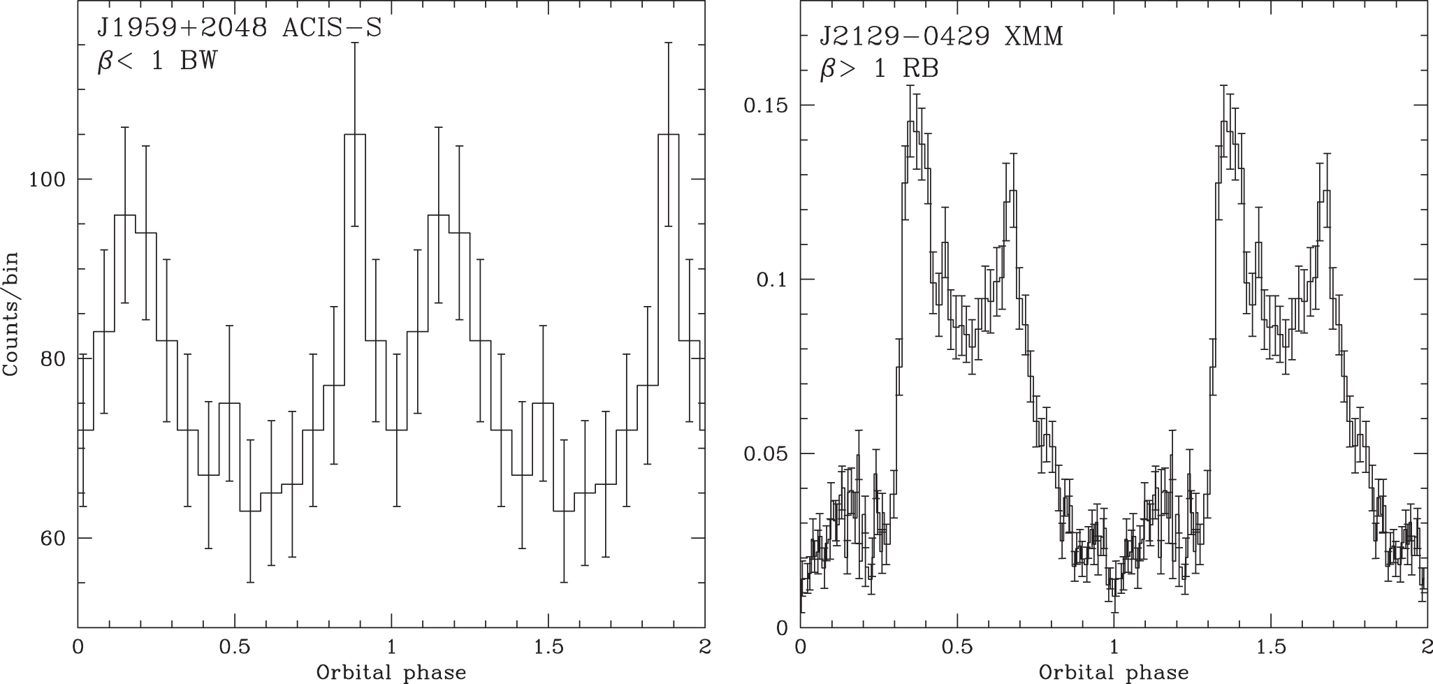 Example binary X-ray light curves, with two periods and phasing as in the lower row of Figure 2. J1959+2048 is a powerful black widow with a weak companion wind (low β). PSR J2129−0429 is a low-power redback undergoing qRLOF (likely high β). These can be compared with the first and last panels of the bottom row of Figure 2.