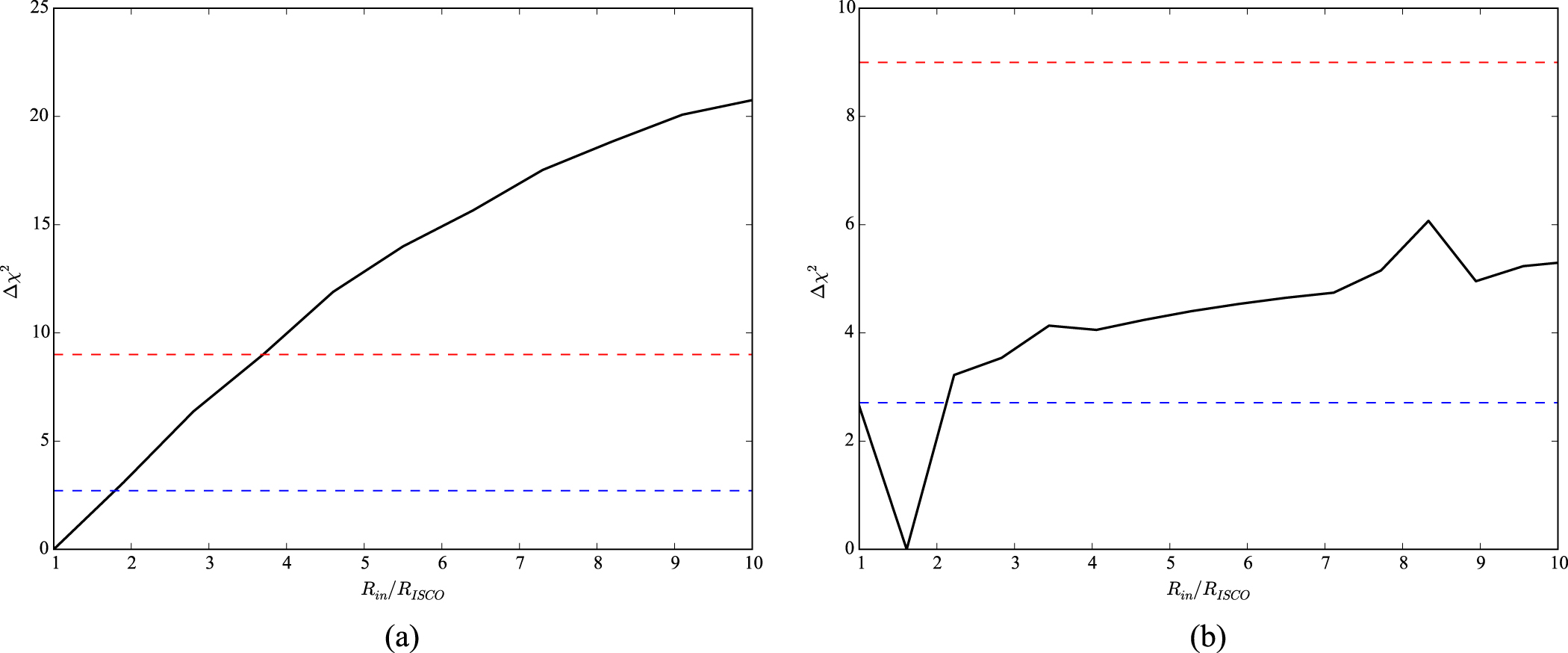 Change in χ2 vs. the change in inner radius, showing that the model is consistent with the disk extending to the ISCO. The dashed blue line marks 90% confidence and the dashed red line marks 99.7% confidence (3σ). (a) Results of the reflionx model (model 1). (b) Results of the relxill model (model 5).