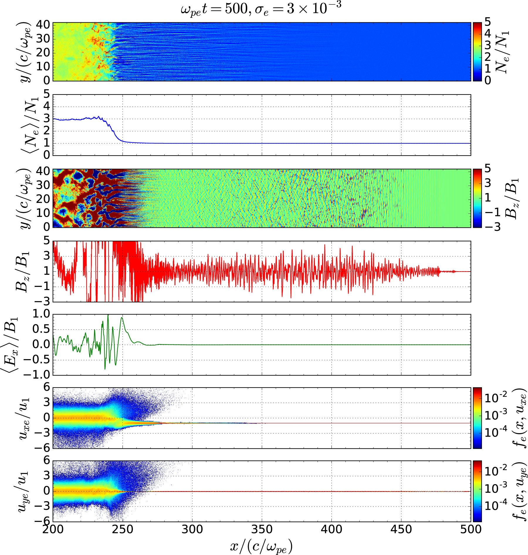 Global shock structures at ﹩{\omega }_{\mathrm{pe}}t=500﹩ for ﹩{\sigma }_{e}=3\times {10}^{-3}﹩. See the caption of Figure 2 for details. Note that the color scale for Bz was chosen such that the precursor waves become clearly visible; the Weibel-generated magnetic fields in the shock-transition region are out of scale.
