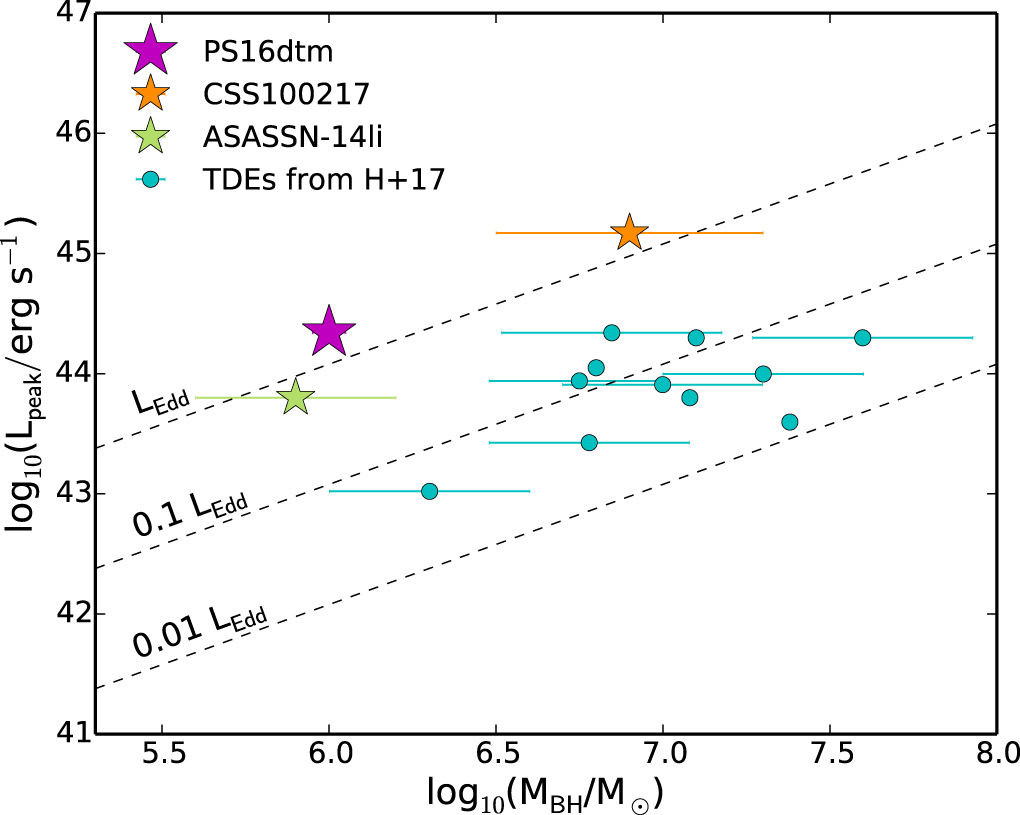 Peak luminosity vs. black hole mass for PS16dtm, CSS100217, ASASSN-14li, and the sample of TDEs considered by Hung et al. (2017). The three dashed lines represent luminosity as a function of black hole mass for Eddington ratios of 1, 0.1, and 0.01. For ASASSN-14li, we use the black hole mass estimate from Miller et al. (2015). This plot suggests the possibility that TDEs that occur in galaxies hosting an AGN exhibit more efficient accretion, allowing them to radiate at the Eddington luminosity of the SMBH, than TDEs that occur in inactive galaxies.