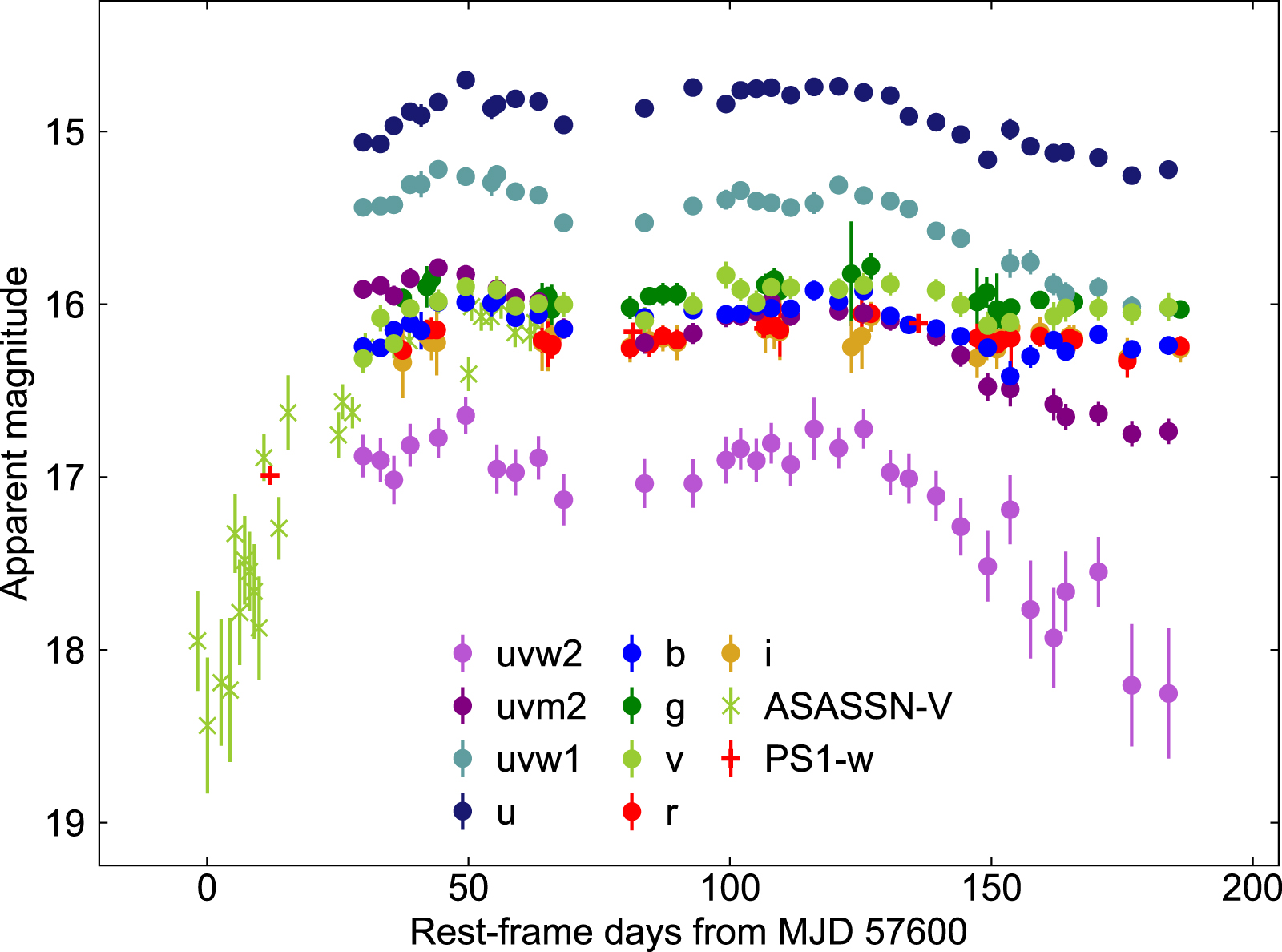 Host-subtracted and Galactic extinction-corrected UV/optical light curves of PS16dtm including our own gri observations, PS1 w-band, archival Swift/UVOT data, and V-band data reported by ASASSN (Dong et al. 2016a).