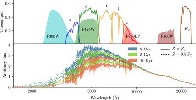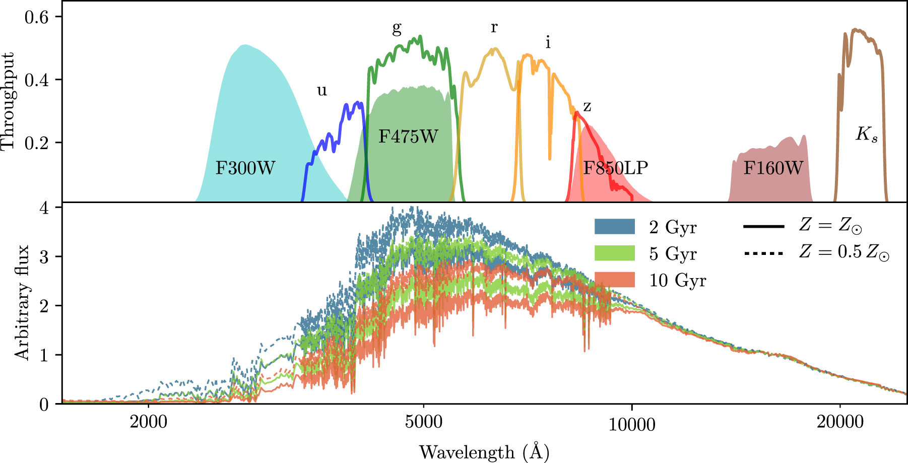 (Top panel) Passbands for the different filters used in this study. Filled curves show the HST filters while open curves show the CFHT filters. Note that the Ks filter is only available for the six galaxies that fall inside the ﹩2\,\deg \times \,2\,\deg ﹩ region around M87. (Bottom panel) Model spectra for selected SSPs using the BC03 models with a Chabrier IMF. Three different ages are shown: 2, 5, and 10 Gyr (blue, green, and red lines, respectively). Solid lines denote SSPs with solar metallicity, while dotted lines correspond to populations with half solar metallicity. The spectra have been normalized at 1.6 μm in the F160W filter.