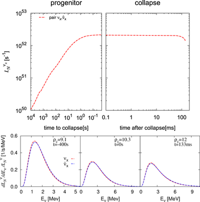 Number luminosity (top) and normalized spectra (bottom) of ﹩{\nu }_{x}﹩ and ﹩{\bar{\nu }}_{x}﹩ emitted via electron–positron annihilation. Note that the number luminosities of ﹩{\nu }_{x}﹩ and ﹩{\bar{\nu }}_{x}﹩ are identical to each other.
