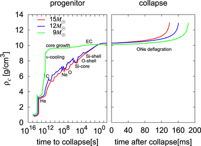 Evolutions of the central density as functions of time for the three progenitors. The red, blue, and green curves correspond to the 15, 12, and ﹩9\ {M}_{\odot }﹩ models, respectively. The origin of the horizontal axis corresponds to the time when the dynamical simulations started. The initiation points of some major nuclear burnings as well as the evolutionary stages for the ONe-core progenitors are marked with labels.