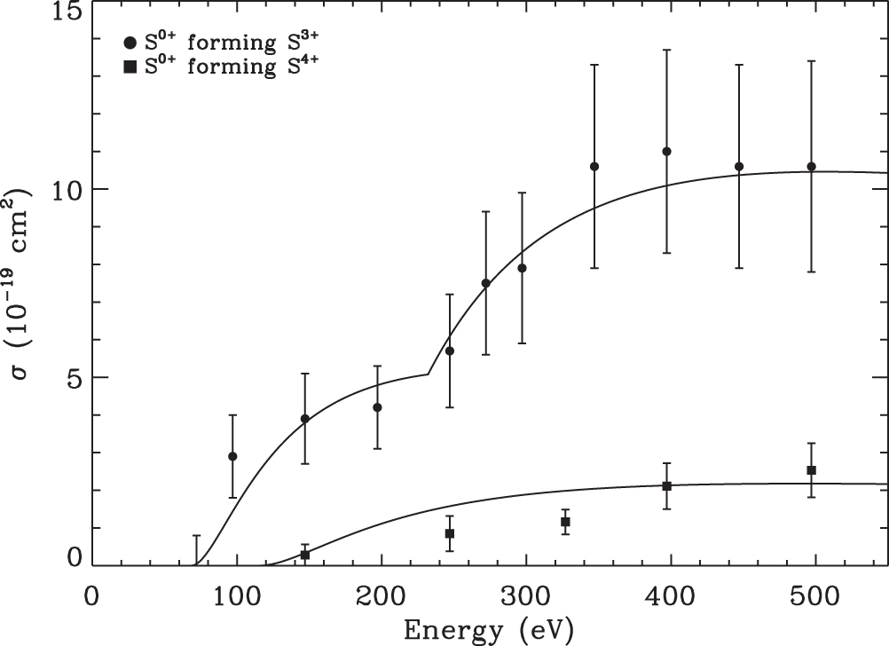 Triple ionization of ﹩{{\rm{S}}}^{0+}﹩ forming ﹩{{\rm{S}}}^{3+}﹩ (filled circles) and quadruple ionization of ﹩{{\rm{S}}}^{0+}﹩ forming ﹩{{\rm{S}}}^{4+}﹩ (filled squares), from the measurements of Ziegler et al. (1982a). The solid curves show our fits to the data using the semiempirical formulae, as discussed in Section 3.15.