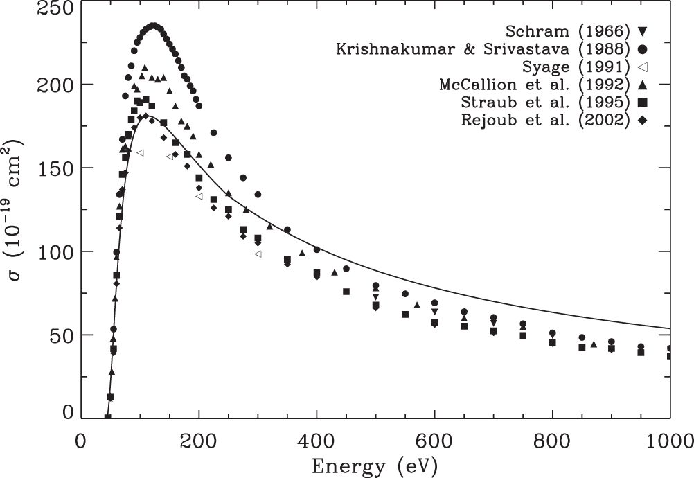 Double ionization of ﹩{\mathrm{Ar}}^{0+}﹩ forming ﹩{\mathrm{Ar}}^{2+}﹩. The symbols show the data of Schram (1966, downward-pointing filled triangles), Krishnakumar & Srivastava (1988, filled circles), Syage (1991, open triangles), McCallion et al. (1992a, filled triangles), Straub et al. (1995, filled squares), and Rejoub et al. (2002, filled diamonds). Our fit, described in the text, is illustrated by the solid curve.