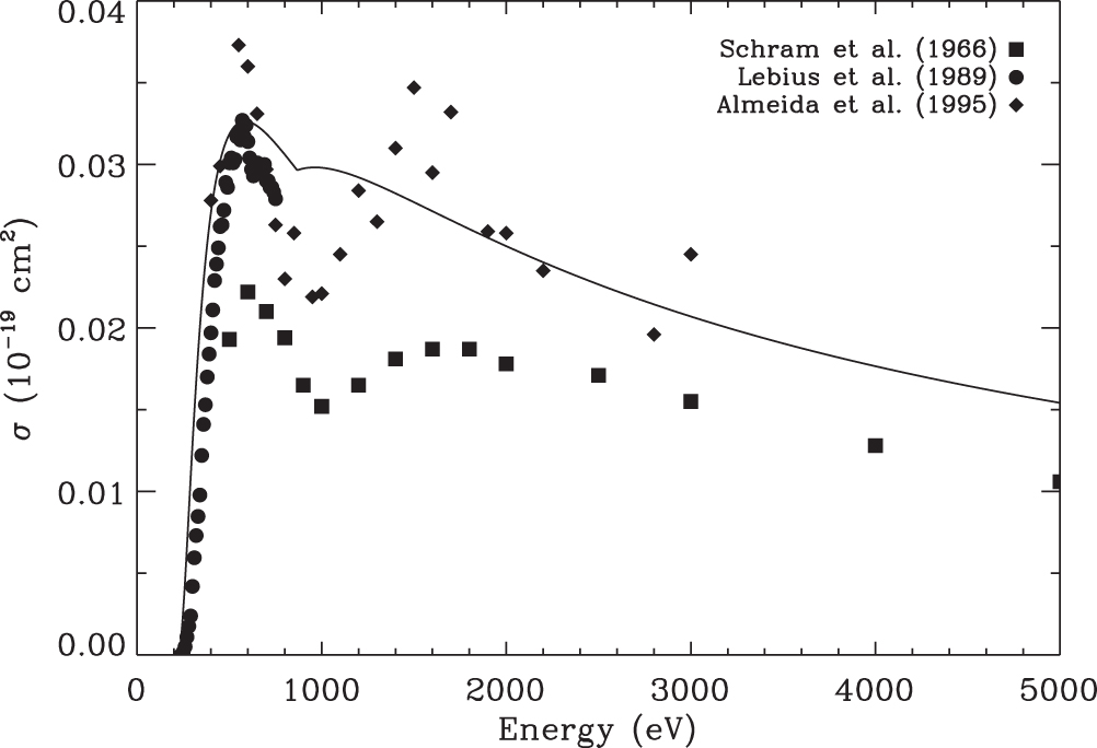 Quadruple ionization of Ne0+ forming Ne4+. The filled squares show the measurements of Schram et al. (1966), the filled circles those of Lebius et al. (1989), and the filled diamonds those of Almeida et al. (1995). The solid curve is our model of the data as described in Section 3.9.