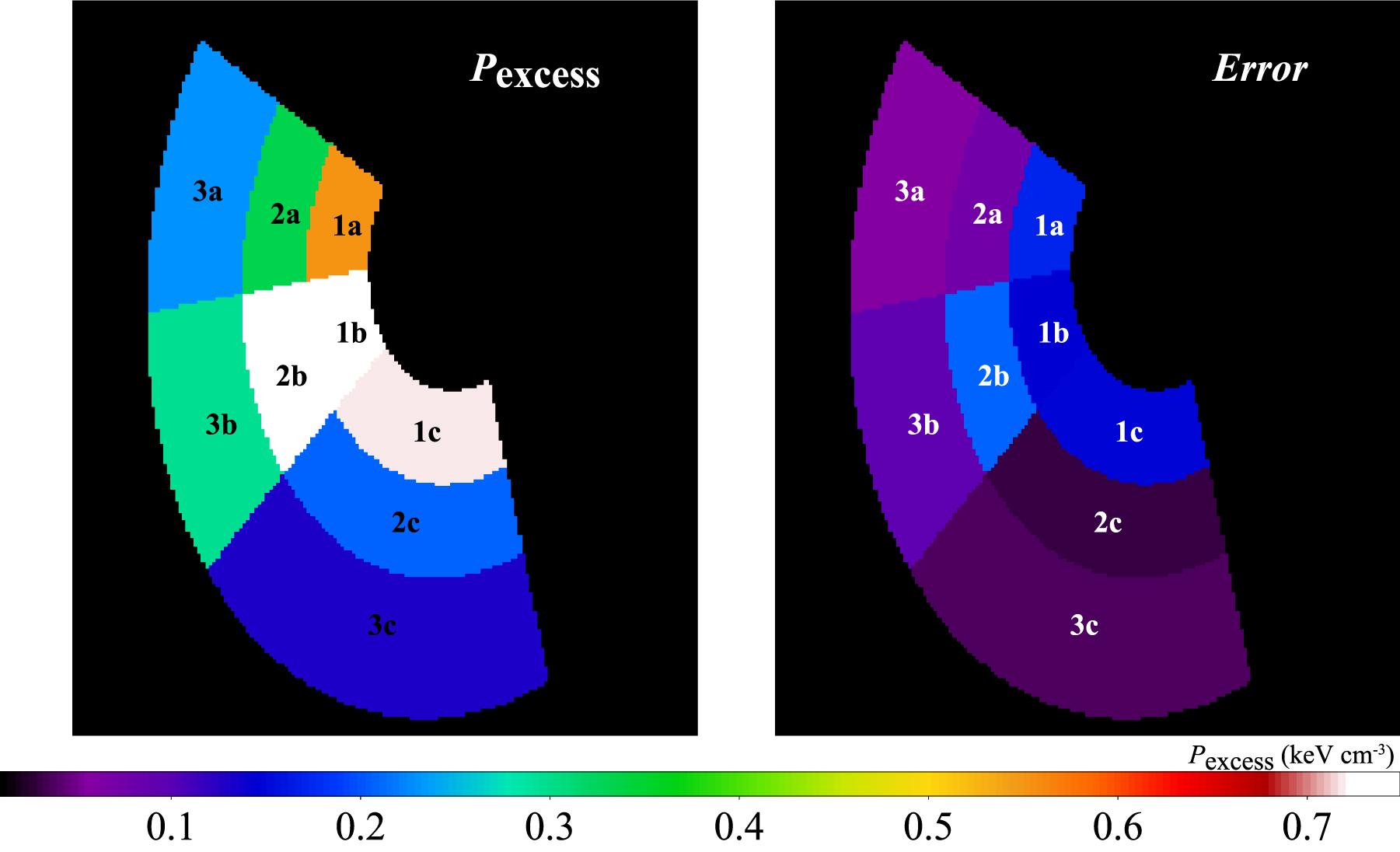 Same as Figure 4 but for the thermal pressure of the excess electrons (pexcess) in units of keV cm−3. The values are also approximately proportional to ﹩{({L}_{\mathrm{excess}}/150\mathrm{kpc})}^{-1/2}﹩.