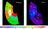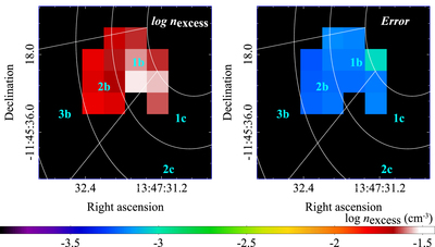 Same as Figure 7, but for the logarithm of electron density (left) and its statistical error (right) in units of cm−3. The values are also approximately proportional to ﹩{({L}_{\mathrm{excess}}/150\mathrm{kpc})}^{-1/2}﹩.
