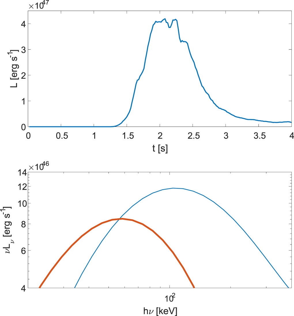 The γ-ray light curve (top panel) and spectrum (bottom panel) during the shock breakout from the uncollimated choked jet simulation describe in the Appendix. The spectrum is divided into the emission during the peak (blue line) and that during the tail (red line). The jet opening angle is 0.7 rad, and it is fully choked long before the shock driven by the cocoon breaks out of the ejecta fast tail. The observer is at an angle of 0.6 rad. The γ-ray signal shows the main properties of GRB 170817A (Goldstein et al. 2017). It starts rising about 1.5 s after the merger, having a peak that lasts about 0.5 s, followed by a longer decay that lasts an additional second. The peak luminosity is comparable to that of GRB 170817A to within an order of magnitude (about a factor of 3 brighter). The spectrum shows a hard-to-soft evolution where the peak of νFν is Ep ≈ 110 keV during the initial pulse (integrated up to 2.3 s) and Ep ≈ 55 keV during the tail (after 2.3 s). This should be compared to GRB 170817A, where in the initial pulse ﹩{E}_{p}=185\pm 62\,\mathrm{keV}﹩ and the tail’s spectrum is consistent with a blackbody with T ≈ 10 keV, where Ep ≈ 40 keV.