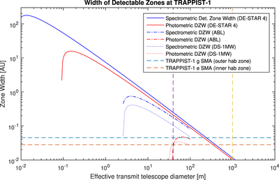 Detectable zone width vs. effective beam waist at TRAPPIST-1. The vertical dashed lines mark the nominal diameter of the ELT (left) and DE-STAR (right).