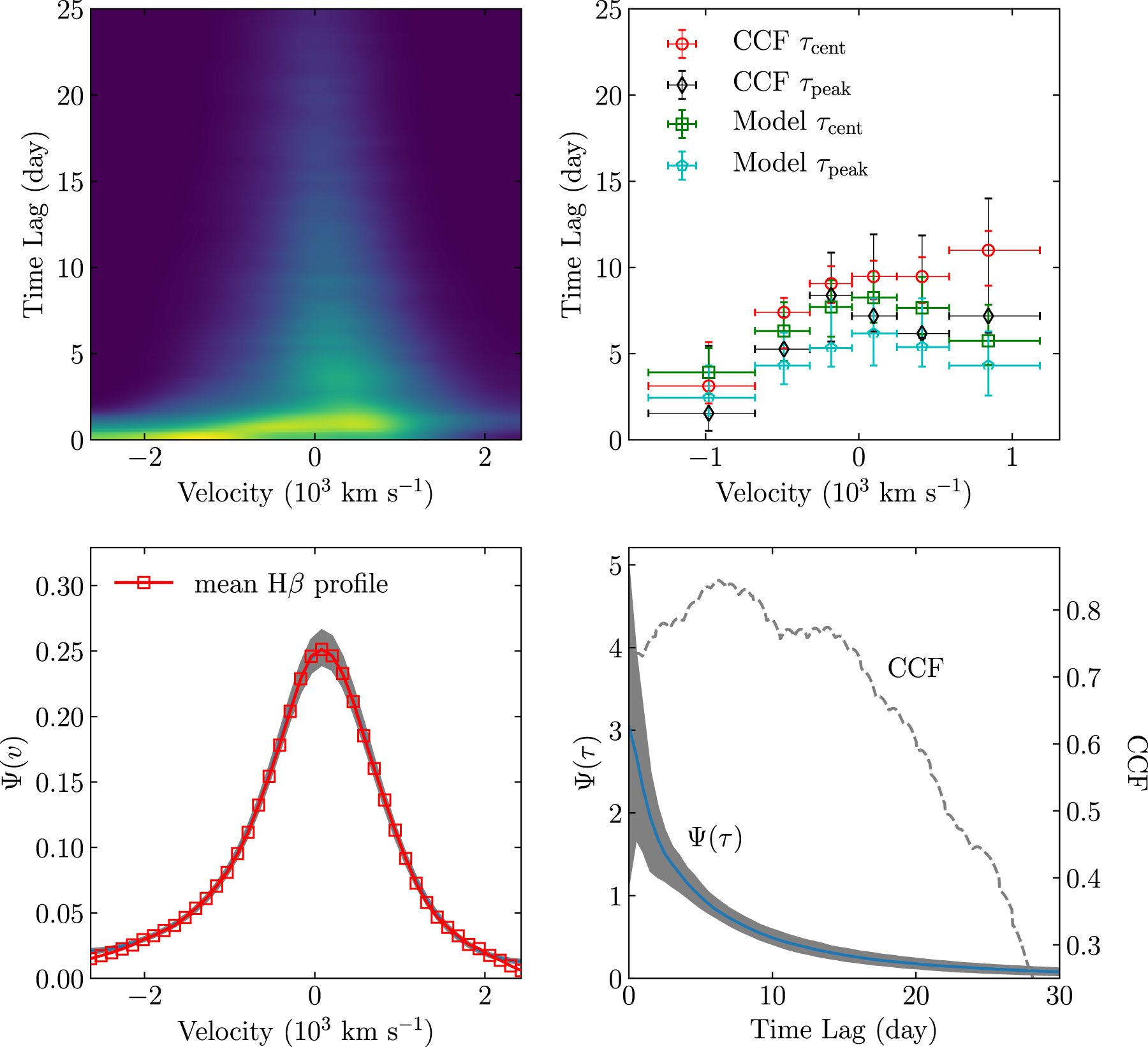 Top left: an example of a transfer function obtained using model M3. Top right: comparison of velocity-binned time lags obtained from model M3 and CCF analysis. Bottom left: delay integral of the transfer function ﹩{\rm{\Psi }}(v)﹩, superposed on the observed, scaled mean Hβ profile. Shaded areas represent the 1σ error band. Bottom right: velocity integral of the transfer function ﹩{\rm{\Psi }}(\tau )﹩. Shaded areas represent the 1σ error band. The dashed line represents the CCF between the observed light curves of the continuum and Hβ fluxes.