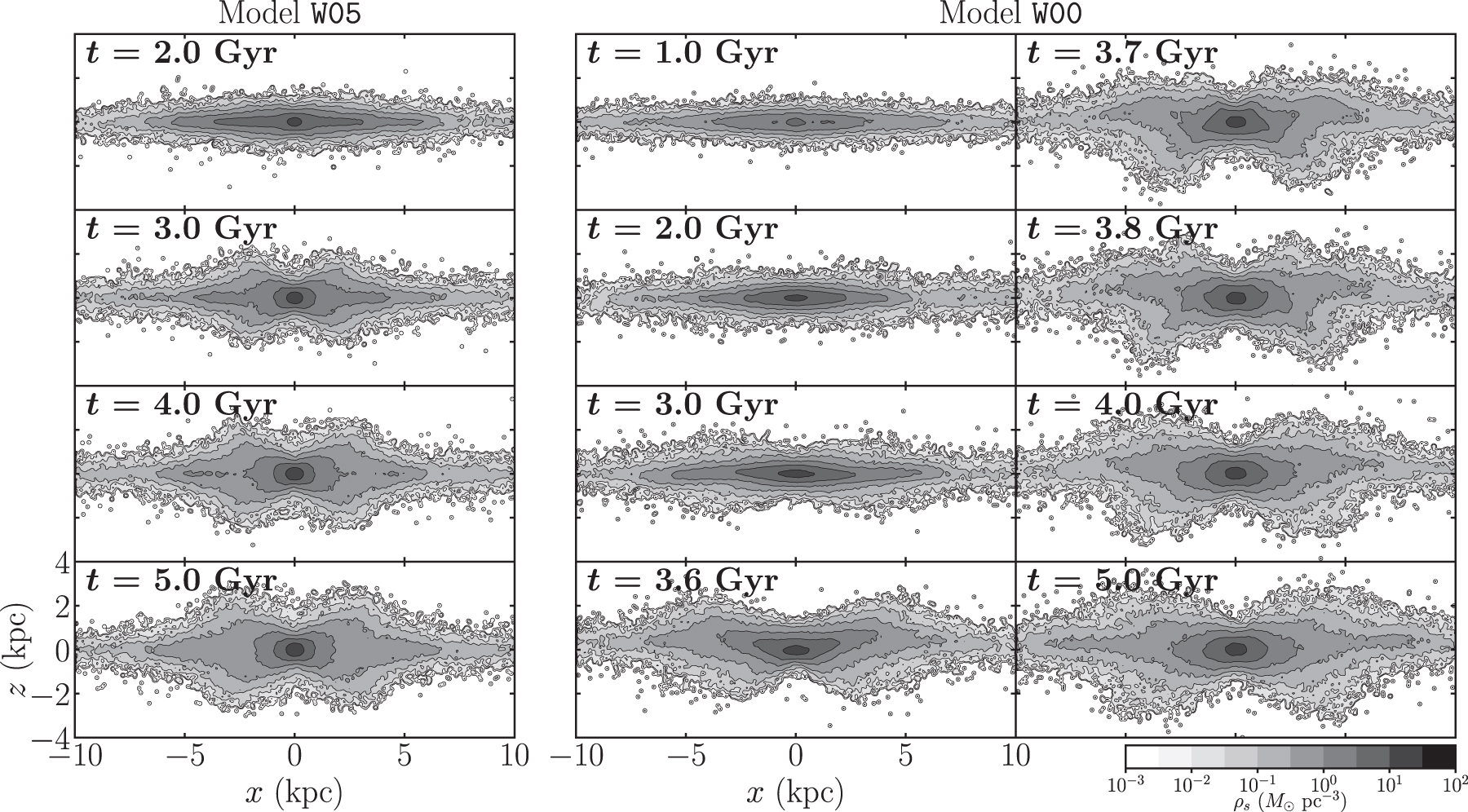 Contours of the logarithm of the stellar density in the x–z plane along the bar semimajor axis for models W05 and W00 at selected times. The disk in model W05 thickens gradually to develop a B/P bulge, while the disk in model W00 undergoes buckling instability at ﹩t=3.5\,\mathrm{Gyr}﹩ to become asymmetric with respect to the z = 0 plane.