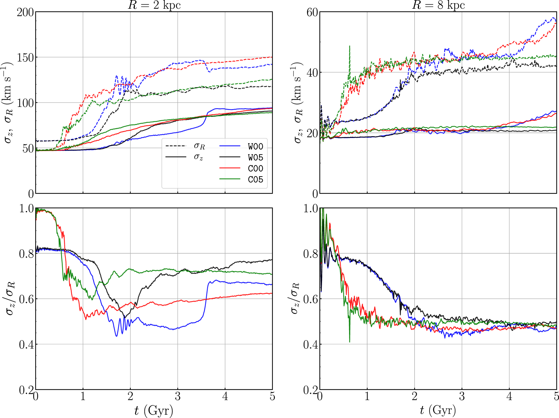 Temporal variations in radial and vertical velocity dispersions (top), and their ratio (bottom) for the models C00, C05, W00, and W05 at ﹩R=2\,\mathrm{kpc}﹩ (left) and ﹩R=8\,\mathrm{kpc}﹩ (right).