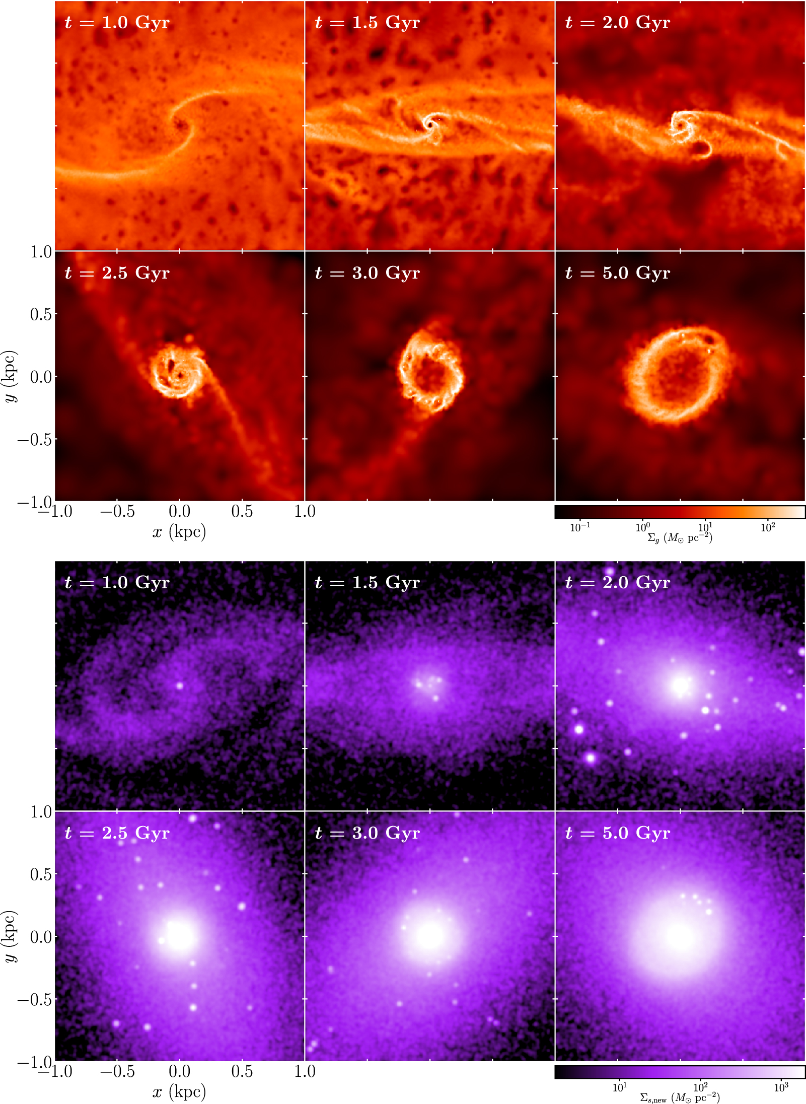 Same as Figure 14, but for the central 1 kpc regions. In the lower panels, the stars represent only the new stellar particles converted from the gaseous disk.