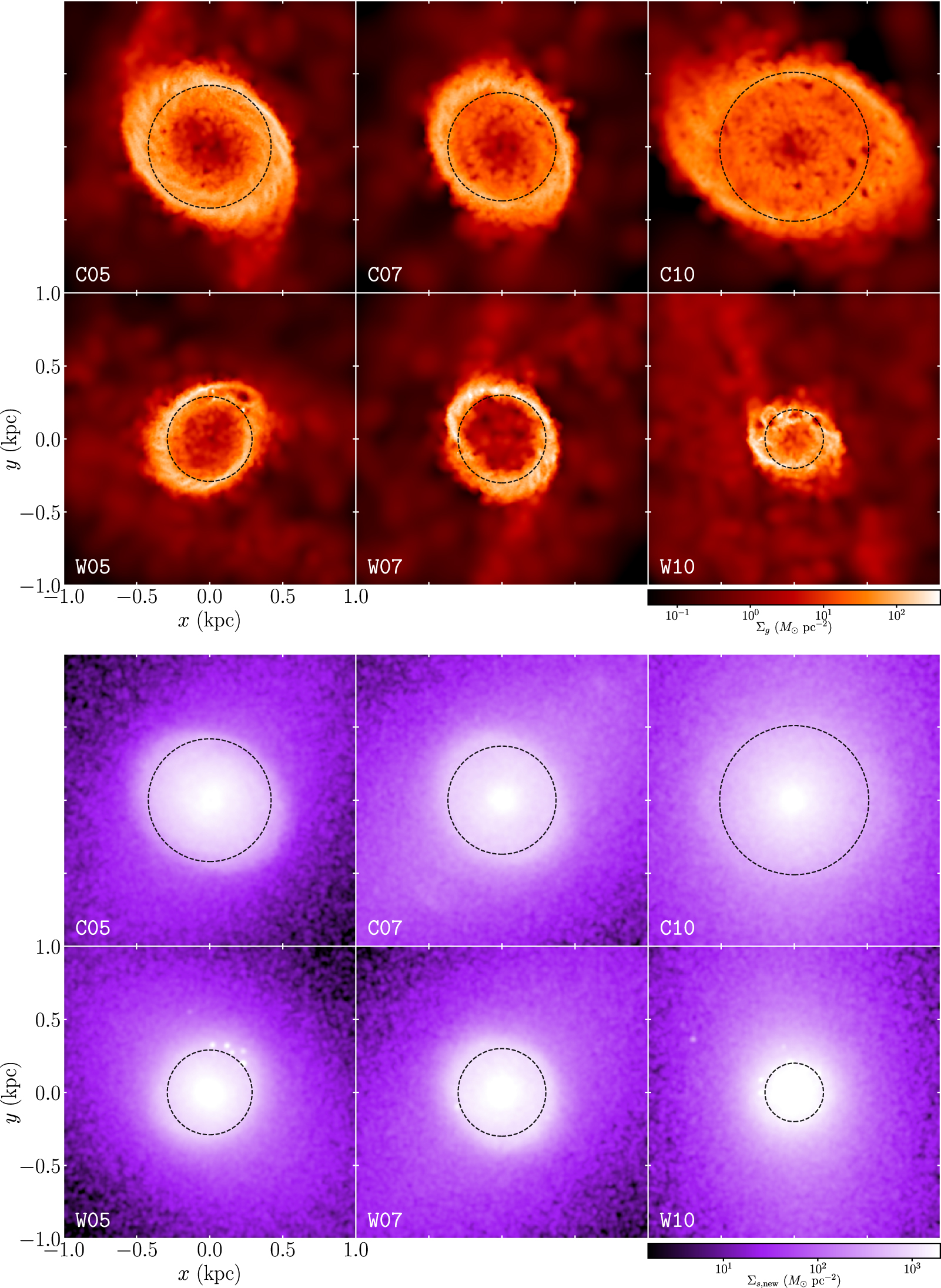 Snapshots of the logarithm of the gas surface density (upper panels) and the surface density of the newly formed stars (lower panels) at ﹩t=5\,\mathrm{Gyr}﹩ in the 1 kpc regions for all models with gas. The dashed circle in each panel draws the ring size calculated from Equation (11).
