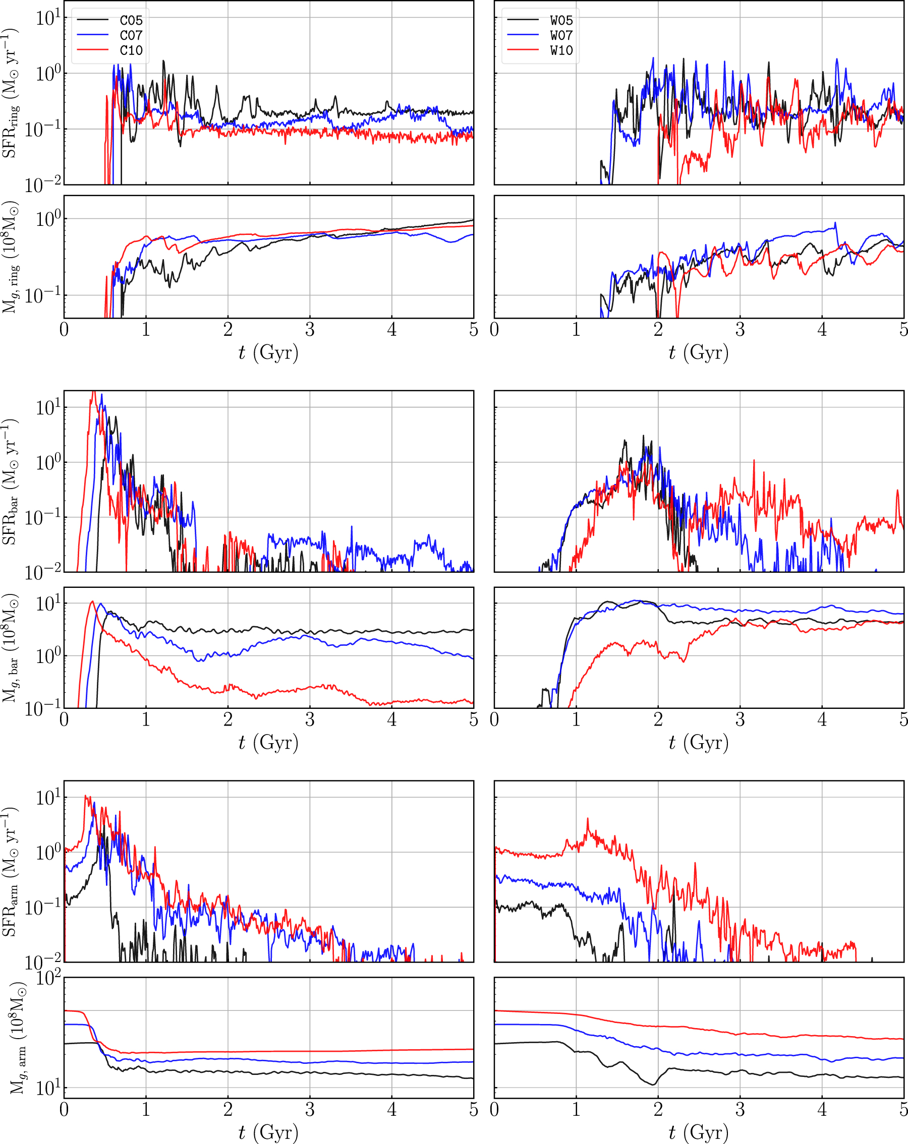 Temporal variations in SFR and the gas mass in the ring regions at ﹩R\lt {R}_{\mathrm{ring}}+0.2\,\mathrm{kpc}﹩ (top), the bar regions at ﹩{R}_{\mathrm{ring}}+0.2\,\mathrm{kpc}\lt R\lt {R}_{b}+0.5\,\mathrm{kpc}﹩ (middle), and the arm regions at ﹩R\gt {R}_{b}+0.5\,\mathrm{kpc}﹩ (bottom). The left and right panels are for the cold- and warm-disk models, respectively.