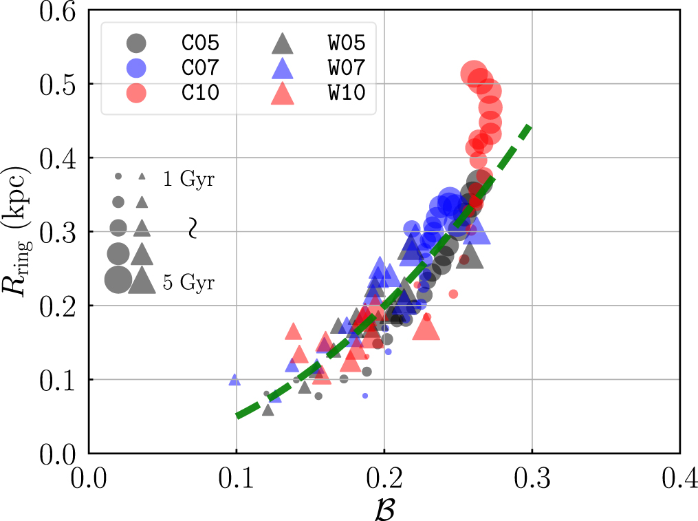 Sizes of nuclear rings against the dimensionless parameter ﹩{ \mathcal B }\propto \mathrm{CMC}/({A}_{2}^{0.3}{{\rm{\Omega }}}_{b}^{0.2})﹩ defined in Equation (12). The symbol sizes correspond to the simulation time. The dashed line draws ﹩{R}_{\mathrm{ring}}/(1\,\mathrm{kpc})=5{{ \mathcal B }}^{2}﹩, which fits the numerical results reasonably well, except for model C10 with the oval.