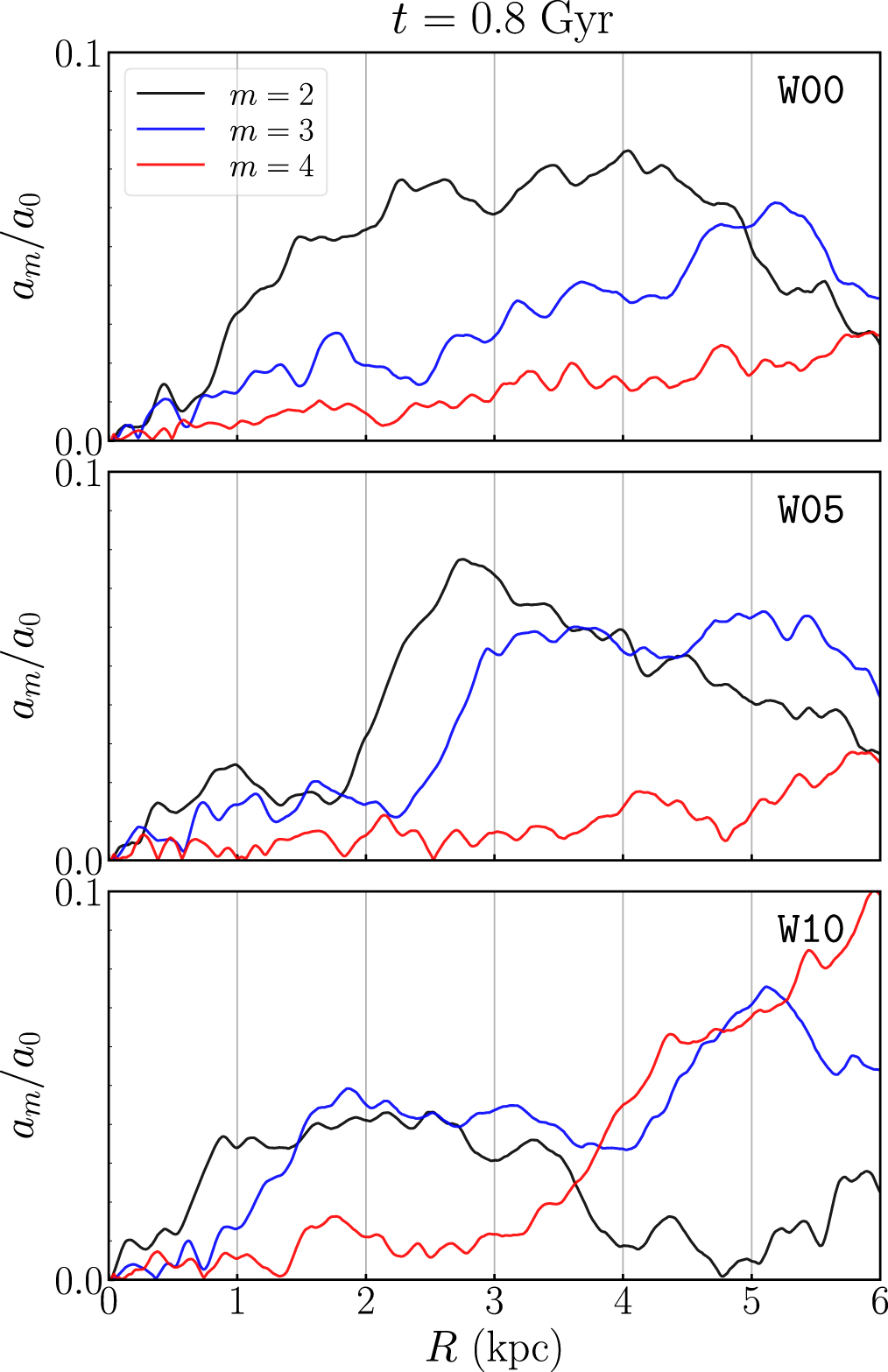 Radial distributions of the normalized Fourier amplitudes ﹩{a}_{m}/{a}_{0}﹩ of the stellar surface density for m = 2–4 modes in models W00, W05, and W10 at ﹩t=0.8\,\mathrm{Gyr}﹩.