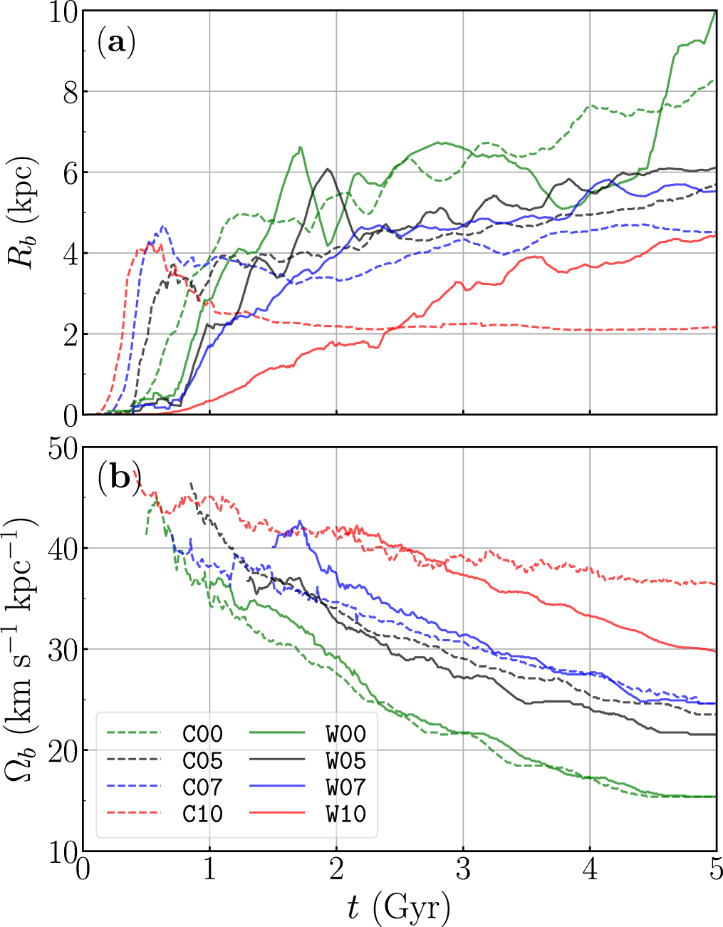 Temporal changes in (a) the bar semimajor axis Rb and (b) the bar pattern speed ﹩{{\rm{\Omega }}}_{b}={{\rm{\Omega }}}_{p}(R=3\,\mathrm{kpc})﹩. The solid and dotted lines correspond to the models with the warm and cold disks, respectively.