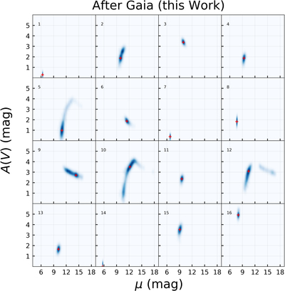 Set of 2D distance–extinction stellar posteriors toward the Perseus molecular cloud (l = 159.°3, b = −20.°6) after incorporating parallax measurements from Gaia DR2 (see Section 3.1). The most probable distance and extinction to each star is marked with a red cross in each panel. For high signal-to-noise parallaxes, the Gaia DR2 data alone can significantly constrain the distance modulus (panels 1, 7, 8, and 14). However, even for parallaxes with more moderate signal-to-noise measurements, the Gaia DR2 data help break degeneracies between a star being a nearby “dwarf” or a faraway “giant” by significantly favoring one solution over the other (panels 3, 9, 11, and 15). An interactive version of this figure showing the differences before and after Gaia is available at https://faun.rc.fas.harvard.edu/czucker/Paper_Figures/stellar_post_comp.html and online.