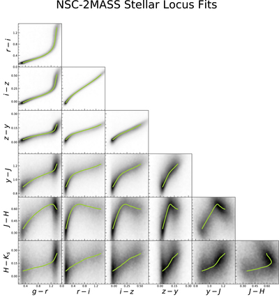 Stellar locus fit used to create our new NSC−2MASS stellar templates. Each panel shows a different 2D projection of our fit in seven-dimensional color space. See Appendix B for more details.