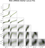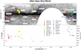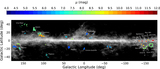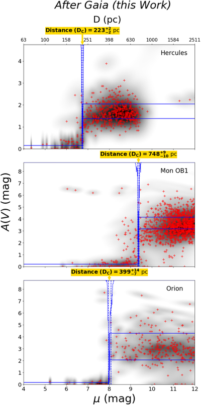 Fitting procedure for three sightlines from Schlafly et al. (2014), with a sightline from Hercules (l = 45.°1, b = 8.°9) shown in the top panel, Mon OB1 (l = 201.°4, b = 1.°1) in the middle panel, and Orion (l = 208.°4, b = −19.°6) in the bottom panel. The background grayscale shows the stacked distance–extinction posteriors for all the stars used in the fit. The most probable distance and extinction to every star are marked with red crosses. The blue line shows the typical extinction profile inferred for the sightline. Prior to the cloud distance DC (at distance modulus μC), the magnitude of the extinction profile is equal to the foreground extinction, with the median foreground extinction f shown via the blue horizontal line. The probable range of distances to the cloud is shown via the inverted blue histogram at the top of each panel, with the median cloud distance marked via the blue vertical line. On either side we show the 16th and 84th percentile of the cloud distance (derived from our dynesty “chain”) via the vertical blue dashed lines. Beyond the cloud distance, the bottom and top blue lines show the 16th and 84th percentile of the Planck-based extinction toward the stars, multiplied by the median normalization factor N inferred for the sightline. The distance uncertainties do not include any systematic uncertainties, which we estimate to be 5% for this work and 10% for Schlafly et al. (2014). An interactive version of this figure showing the differences before and after Gaia is available at https://faun.rc.fas.harvard.edu/czucker/Paper_Figures/threepanel_comp.html and in the online version of the published article.