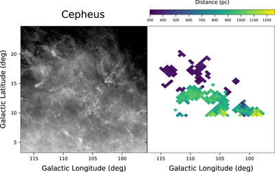 Pixelated distance map for the Cepheus molecular cloud. The left panel shows the Planck E(B − V) reddening map in the region around Cepheus. The right shows the set of healpix pixels associated with the cloud (see Table 1 and Section 4.2) colored by their median distance. We find Cepheus clearly hosts two separate components: a “near” component (purple pixels) and a “far” component (yellow or green pixels). An interactive version of this figure that includes each pixel’s line-of-sight extinction profile is available at https://faun.rc.fas.harvard.edu/czucker/Paper_Figures/Cepheus.html in the online version of the published article. Similar figures for every cloud in Table 1 are accessible via Figure 8. A machine-readable table of the per-pixel results for every pixel shown above in Cepheus is available on the Dataverse (https://dataverse.harvard.edu/dataverse/cloud_distances) (doi:10.7910/DVN/74Y5KU). Similar tables are available for every cloud in Table 1.