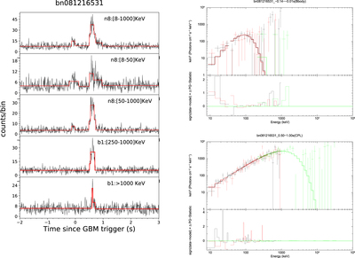 Left panel: SGRB light curves with precursors observed by only Fermi, as identified by the BBlocks analysis. Right panel: the better-fitting spectra (CPL or BB model) for precursors (top) and main bursts (bottom). The red and black, and green points are data observed with Fermi NaI, and BGO, respectively.
