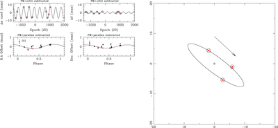 AGA fit of DoAr21b obtained with the combined model. Left: the upper panels show the parallax after removing proper motions and the contribution of the orbit of DoAr21b. The lower panels show the orbit of DoAr21b after removing proper motions and parallax. The black dots correspond to the observed astrometric data with their error bars. The red crosses indicate the expected position at the observed epochs. The orbit of this companion is plotted as function of the phase orbit. The R.A. and decl. offsets are relative to the estimated barycenter position of the source. Right: the solid line shows the orbit of DoAr21b around the host star. The open circles indicate the estimated positions of DoAr21b with respect to the host star (black star at the center of the orbit), and the red crosses indicate the predicted positions along the orbit at the observed epochs. The red dots indicate the positions of the observed companion. The error bars of these data points are smaller than the size of the dot. There is an excellent agreement between the observed positions and the predicted positions.