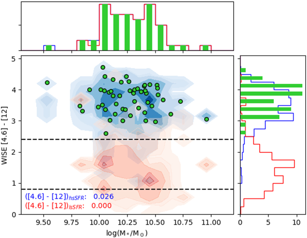 WISE [4.6]–[12] color vs. galaxy stellar mass (colors and symbols as in Figure 1). The IRTZ is labeled with black dashed lines. BreakBRD galaxies all lie in the star-forming region of this diagram.