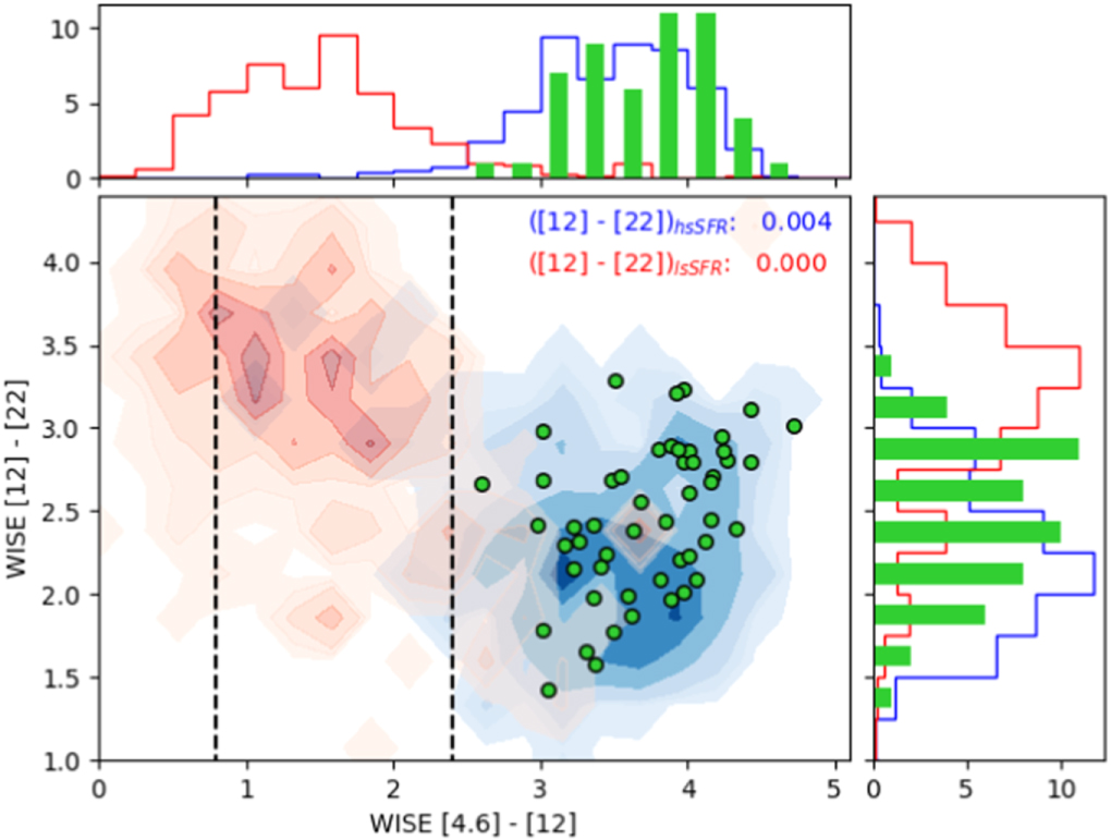 WISE [12]–[22] vs. [4.6]–[12] color–color diagram. The [12]–[22] colors indicate that these galaxies are unlikely to be ellipticals.