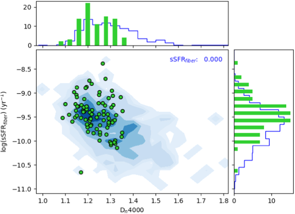 Dn4000 measure in the central fiber compared to the fiber sSFR from B04 for the star-forming subsamples of the breakBRD and high-sSFR parent samples. Our galaxies mostly have higher central sSFRs than the parent star-forming sample.