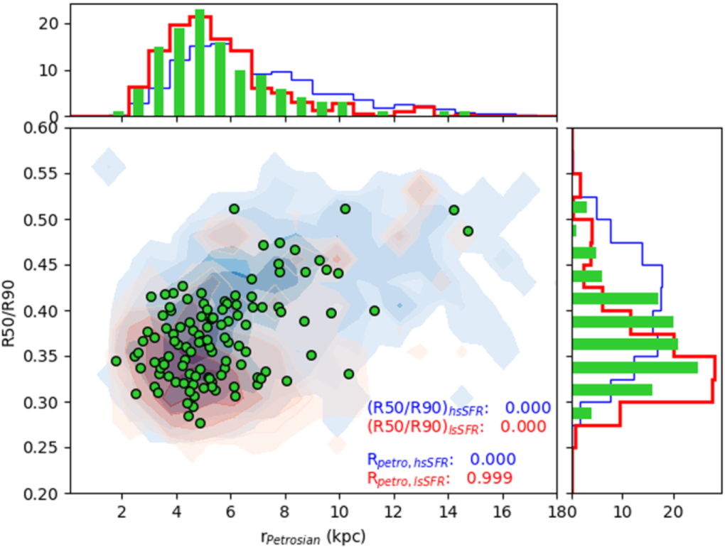 Petrosian radius (as defined by the SDSS project in Blanton et al. 2001 and Yasuda et al. 2001) vs. the inverse galaxy concentration ratio (R50/R90), with colors and symbols as in Figure 1. This ratio has shown to be a simple morphology discriminator, but our parent sample selection biases this tracer. Our sample of galaxies overlays the underlying distribution.