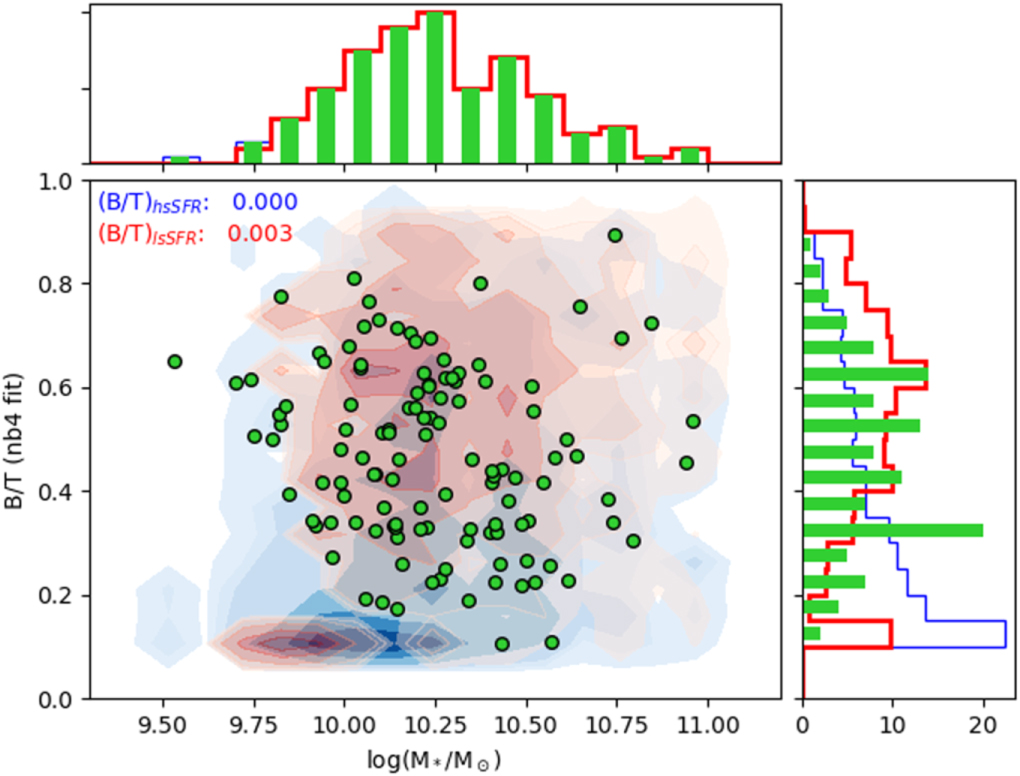 B/T ratio (using the nb4 bulge+disk fit) of the breakBRD sample (green circles) compared to the low- and high-sSFR parent samples (red and blue contours, respectively). Our galaxies are more bulge dominated than the high-sSFR parent sample.