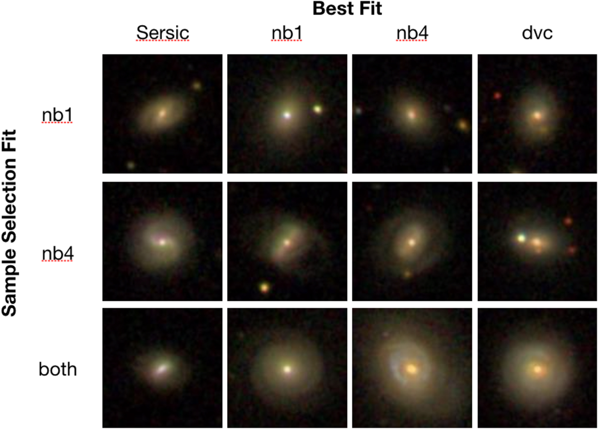 Sample postage stamp images of breakBRD galaxies drawn from the SDSS imaging survey. The rows (labeled ”Sample Selection Fit”) indicate the fit that caused the galaxy to be selected for our sample (see Section 2.2 and LG12 for more details). We note that there are not morphological trends throughout the fits, which motivated our choice to include the broadest set to meet the criteria for sample membership.
