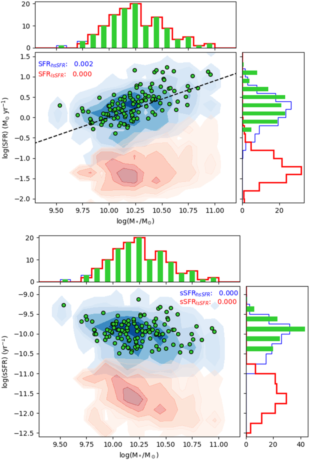 SFR (top) and sSFR (bottom) from B04 integrated across the entire galaxy. The colors and symbols are as in Figure 1. In the top panel we show the star-forming main sequence from Peng et al. (2010) as a black dashed line. Our sample, as selected, is star-forming.