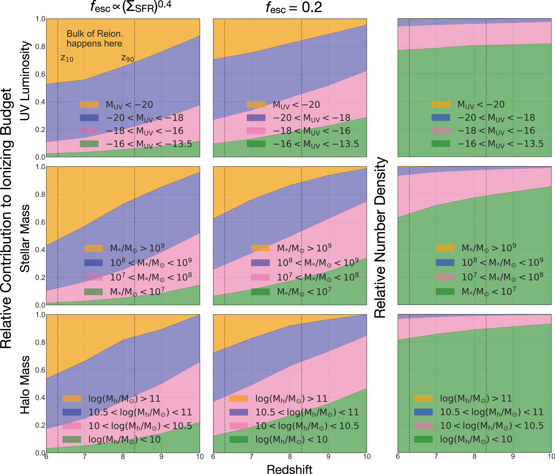 Which galaxies reionized the universe? The top, middle, and bottom panels show groupings of galaxies by MUV (observed), stellar mass, and halo mass, respectively. The left and center columns are shaded by the relative contribution of each group to the total ionizing budget (﹩{\dot{n}}_{\mathrm{ion}}﹩) as per our two models for ﹩{f}_{\mathrm{esc}}﹩. The right-most column is colored by the relative number-density of each group. The black dotted lines in each panel sandwich the redshift-space when the universe is inferred to go from 90% (z90) to 10% neutral (z10). In the central panel, the reionization budget is essentially a reflection of our predicted UVLF, since ξion does not vary strongly with luminosity and ﹩{f}_{\mathrm{esc}}﹩ is constant, while in the left panel the ﹩{f}_{\mathrm{esc}}﹩ ∝ ﹩{{\rm{\Sigma }}}_{\mathrm{SFR}}﹩ model further down-weights the contribution of faint galaxies. UV-bright and massive sources represented in orange and blue dominate the reionization budget (≳50%–80%), despite comprising ≲5% of the population. This scenario, “reionization by oligarchs,” stands in stark contrast to the canonical “democratic reionization” led by copious faint sources.