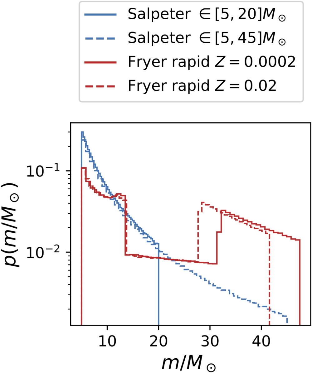 Four different scenarios for initial black hole mass distributions. Blue curves denote a Salpeter-like power law, with the solid (dashed) line corresponding to an upper mass cutoff of 20M⊙ (45M⊙). Red curves denote the Fryer rapid model, with the solid (dashed) line corresponding to a metallicity of 0.0002 (0.02).