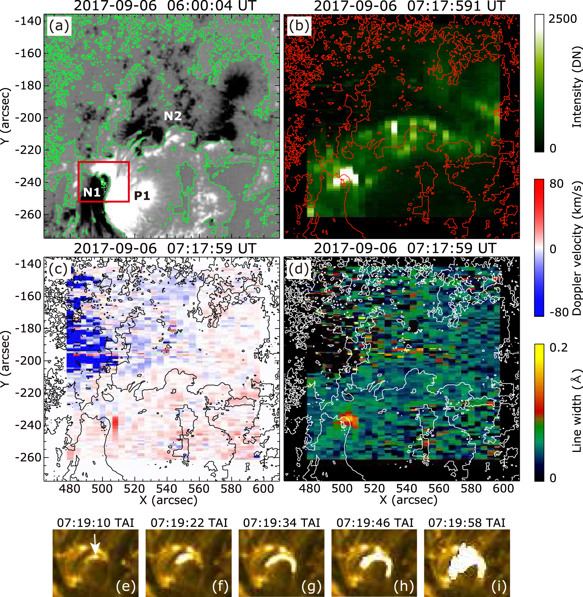 (b) Intensity, (c) Doppler velocity, and (d) line width in the Fe XIV (264.7 Å) line observed by Hinode/EIS. The start time of the scanning is 07:17:59 UT on 2017 September 6, and it takes approximately 3 minutes to scan from the west to east (right to left) in the field of view. The color scales for intensity, Doppler velocity, and line width are depicted on the right. Panel (a) is a reference Bz magnetogram observed by SDO/HMI SHARP at 06:00 UT on 2017 September 6, which is closest in time to the Hinode/EIS observation of panels (b)–(d). The intensity, Doppler velocity, and line width maps and Bz magnetogram are co-aligned with each other, and the green colored magnetic polarity inversion lines in panel (a) are overplotted on panels (b)–(d) denoted in red, black, and white lines, respectively. Temporal evolution of the small cusp-shaped brightening in panel (b) is depicted in panels (e)–(i), which are coronal images captured by SDO/AIA 171 Å in the field of view of the red rectangle in panel (a). The cusp-shaped brightening in panel (b) starts as a tiny brightening that is indicated by the white arrow in panel (e).