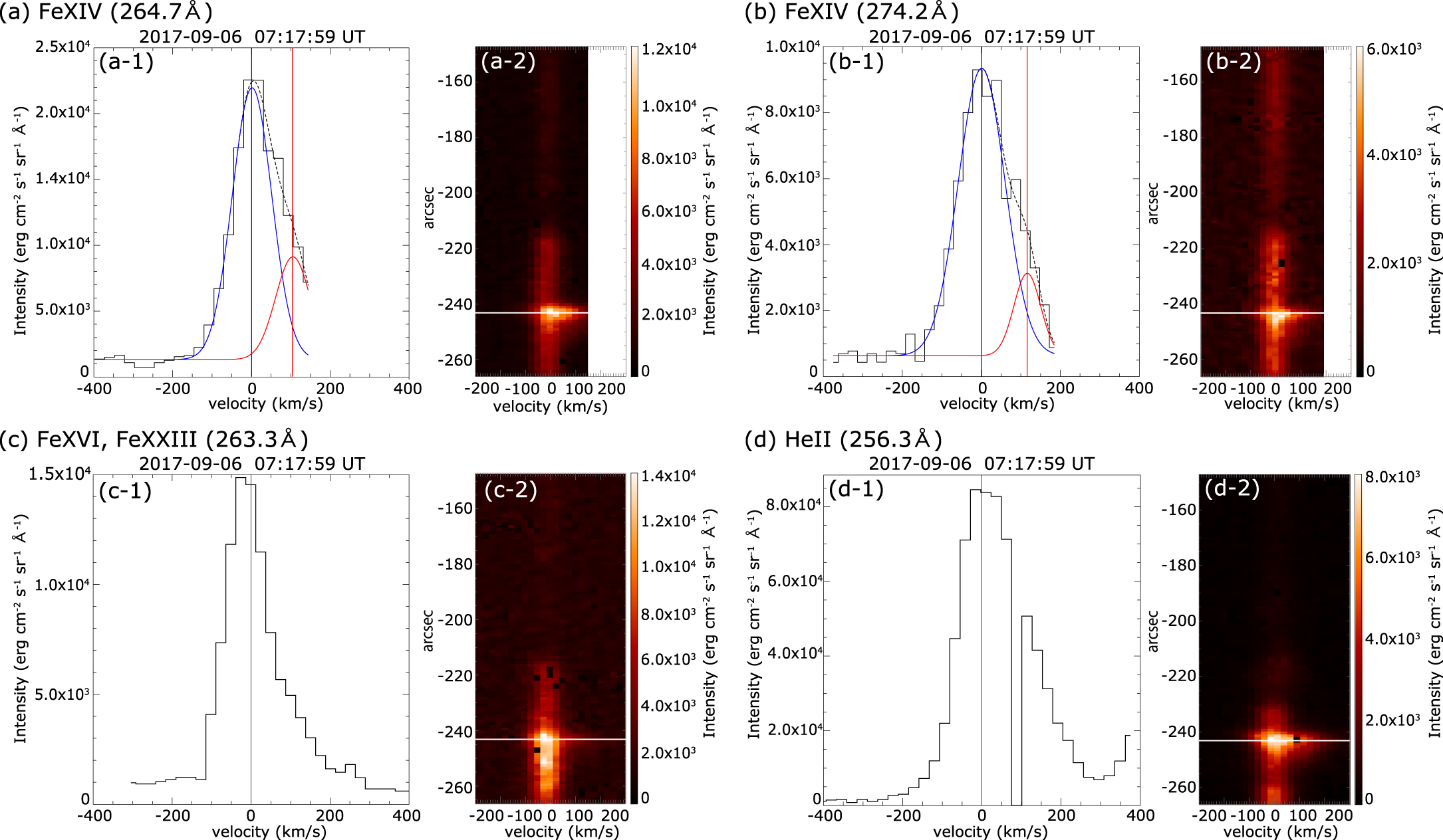Spectral line profiles and spectral images at the single site of the redshifted signal in Figure 4(c). Each panel corresponds to the Fe XIV (264.7 Å), Fe XIV (274.2 Å), Fe XVI/Fe XXIII (263.3 Å), and He II (256.3 Å) lines, respectively. The intensity profiles along the horizontal white line cut in the spectral images on the right are plotted in the images on the left. The vertical axes of the profiles represent intensity, and the vertical axes of the spectral images are represented in spatial arcseconds along the slit. The horizontal axes represent the velocities resulting from single (in panels (c) and (d)) and double (in panels (a) and (b)) Gaussian fitting. The intensity range of the spectral images is depicted in the color scale on the right of each panel. The histogram with the black solid line depicts the intensity of each spectral line. The black broken lines are the result of Gaussian fitting, and the blue/red curves denote the first/second components obtained from double Gaussian fitting for the intensity profiles in panels (a-1) and (b-1). The Doppler velocities of the second components relative to the first components are approximately 103 ± 8 km s−1 for 264.7 Å and 115 ± 16 km s−1 for 274.2 Å, respectively.