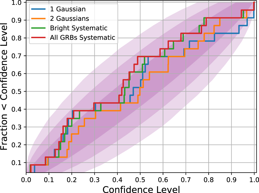 Probability plot for the publicly reported BALROG localizations using estimated systematic models incorporating a single Gaussian and a mixture of two Gaussians. The two Gaussian “core+tail” models appear to be favored. The systematic models estimated for the bright sample and complete sample of GRBs are consistent with that observed for the publicly reported sample within 2σ.