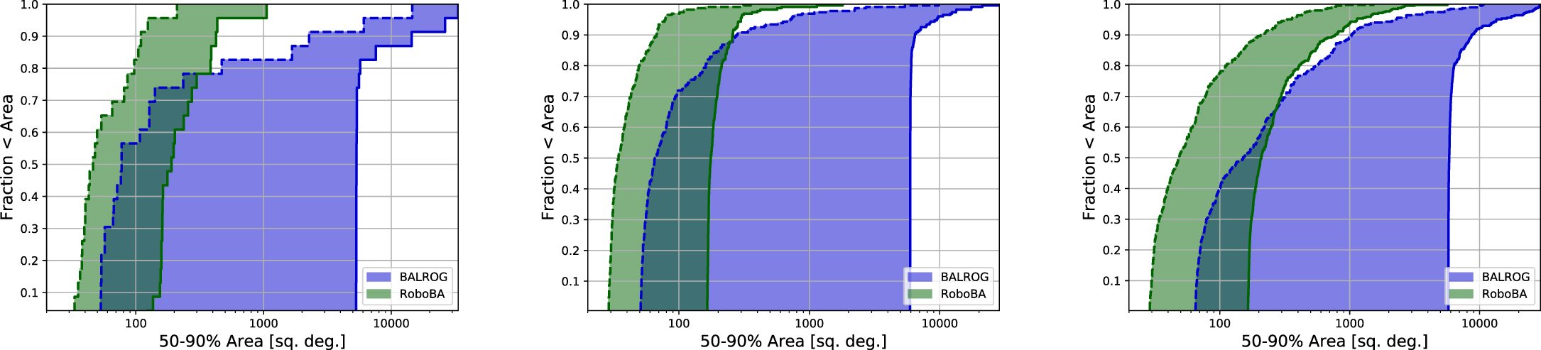 Cumulative distributions of the area for the 50%–90% confidence intervals for the public automated localizations (left panel) for RoboBA and BALROG, the bright sample (middle panel), and the full sample (right panel) by applying the corresponding systematics.