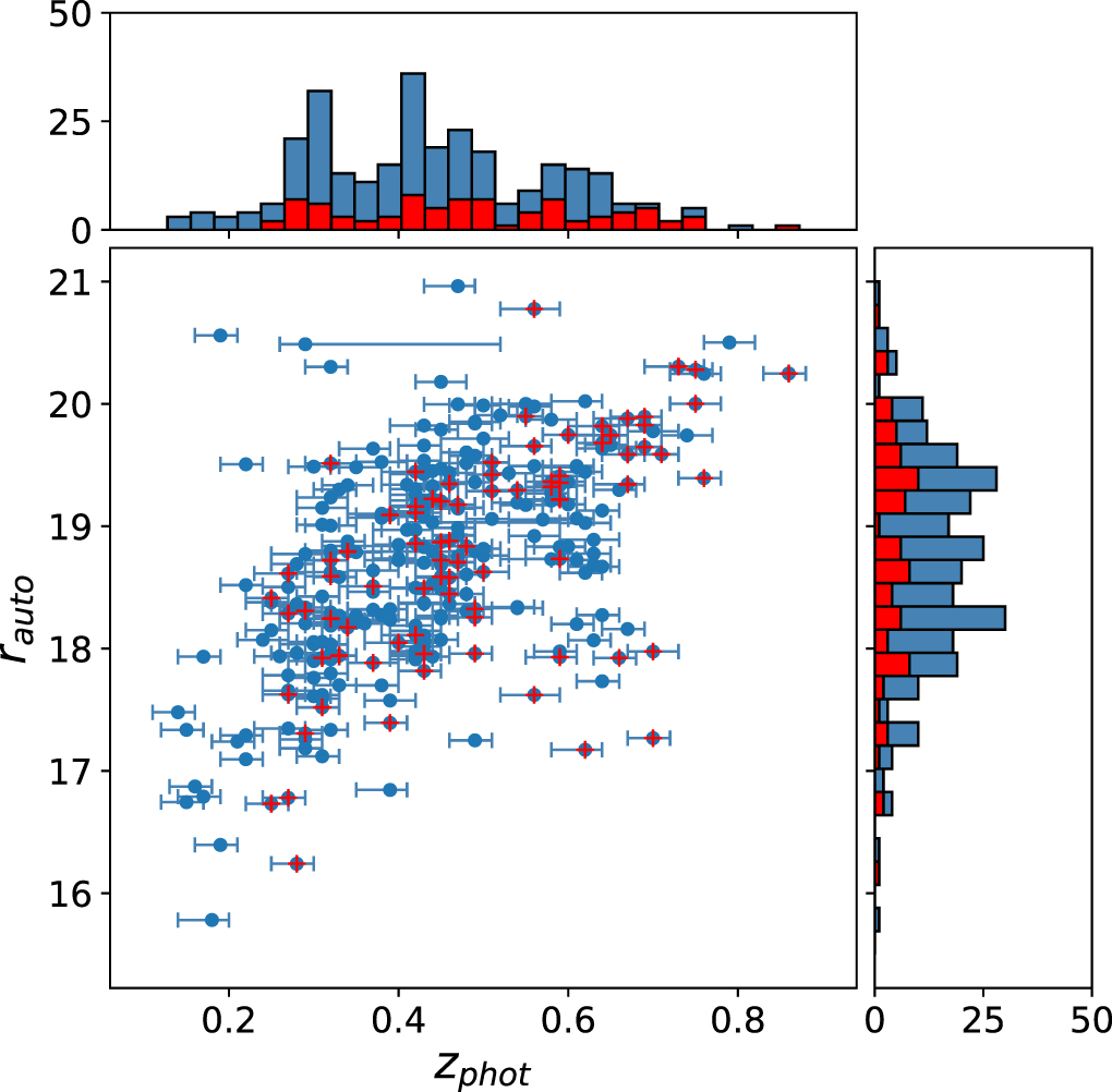 Distribution of the 286 lens candidates in the photometric redshift–luminosity space of the foreground deflectors. The dots marked by red plus signs are the first 82 candidates shown in Figure 8. The error bars on the rauto magnitudes are smaller than the symbol sizes.